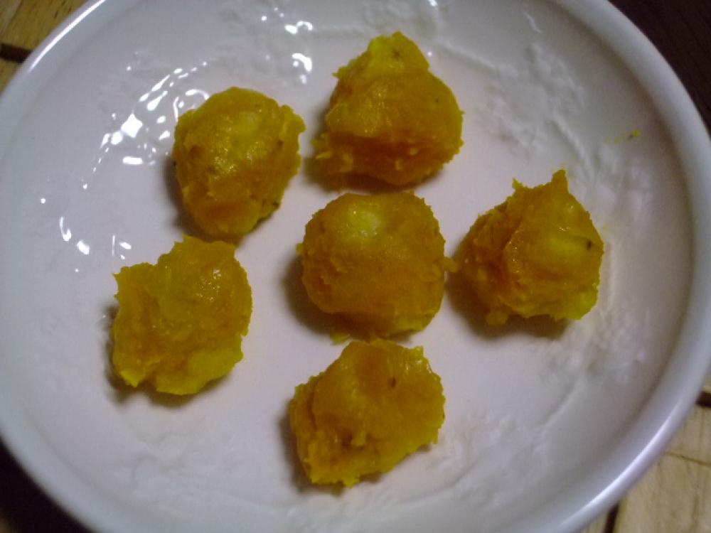 赤ちゃんの一口大に丸めてグラタン皿に並べます
