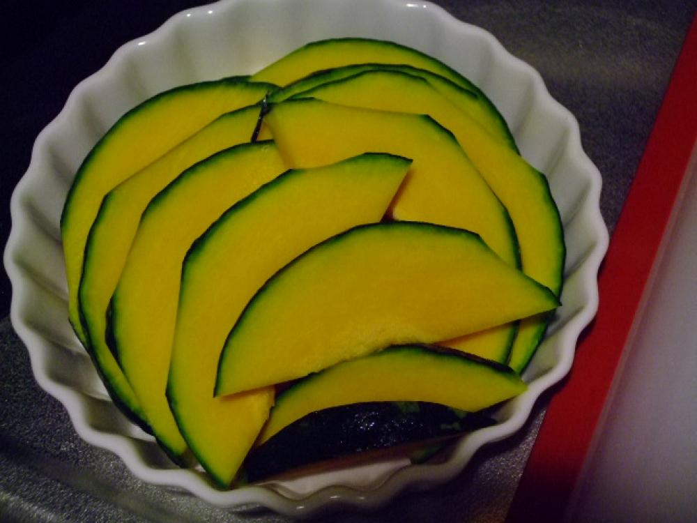 ![]() かぼちゃは種を除き、よく洗って汚い皮をそぎ落とします