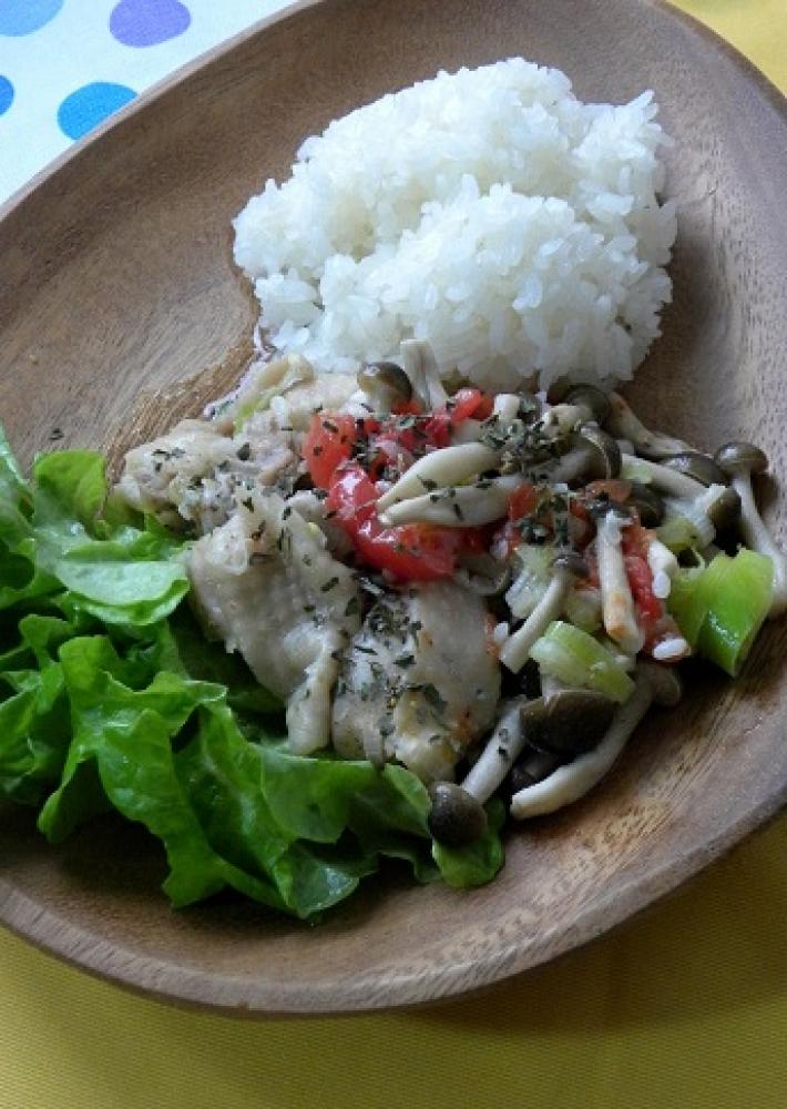 鶏もも肉は食べやすい大きさに切る。トマトはヘタを取って乱切り、しめじはいしづきを取ってほぐしておく。
