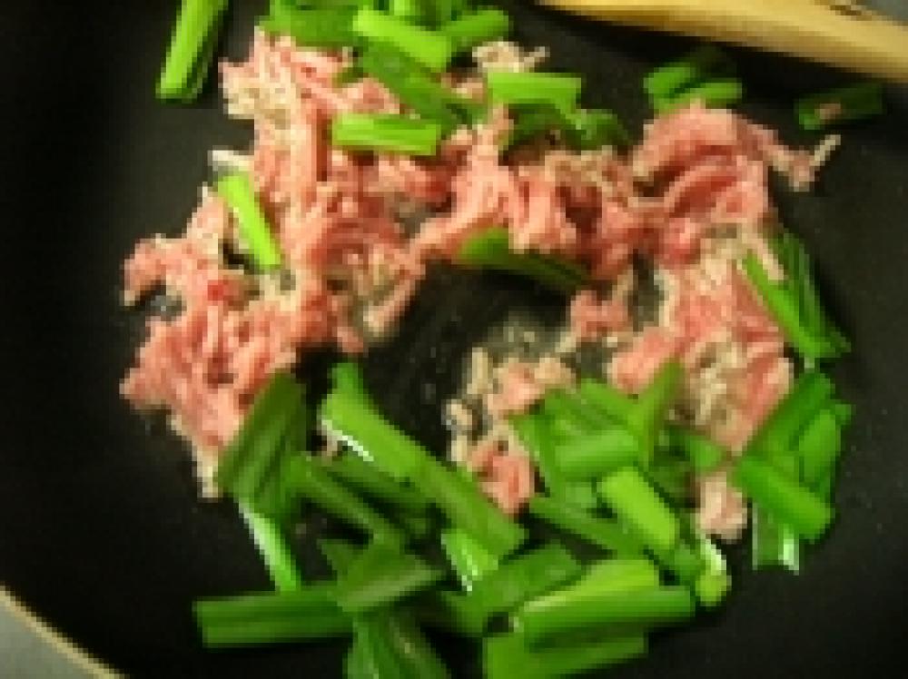 ![]() フライパンを熱し、サラダ油を引き、ひき肉とニラを炒めます。