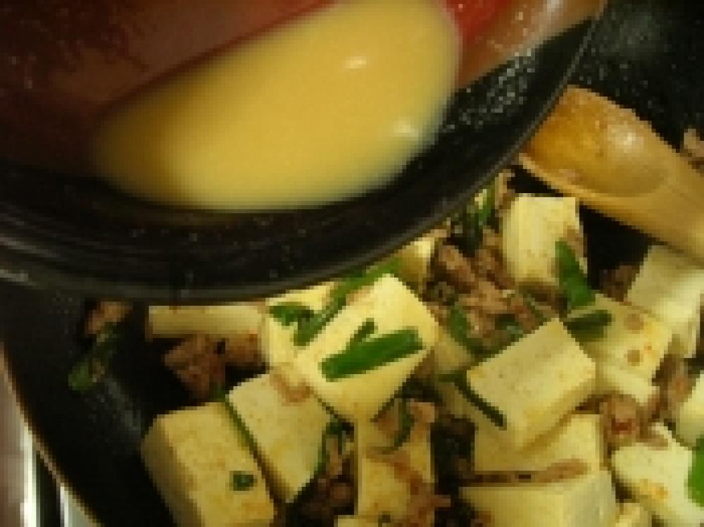 ![]() 2に豆腐と3の味噌を加え豆腐がグツグツしてきたら火を止めます。