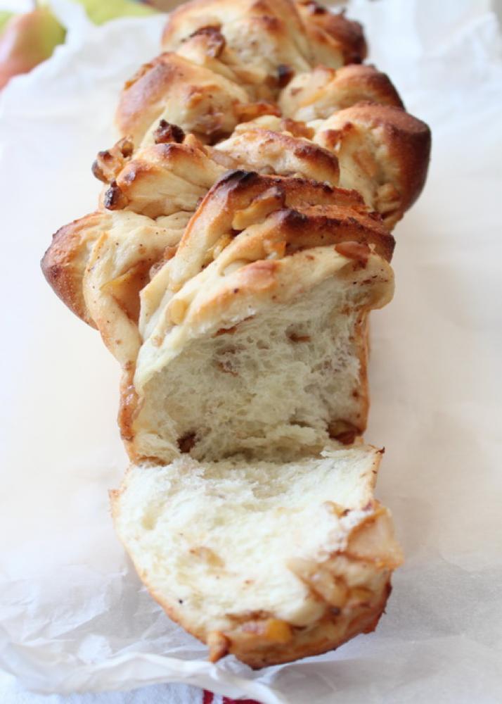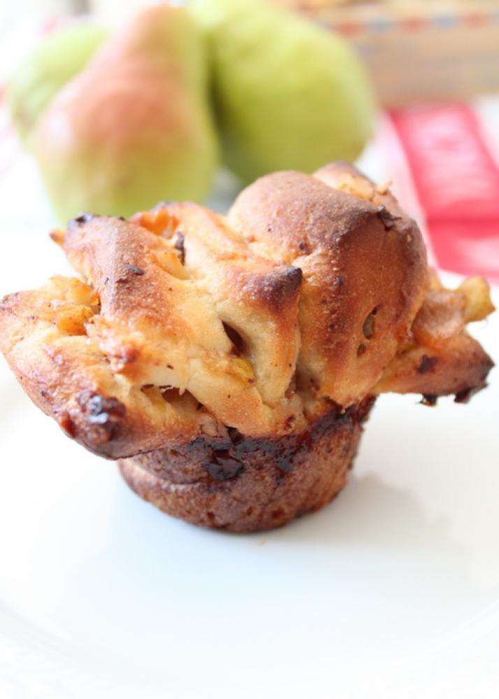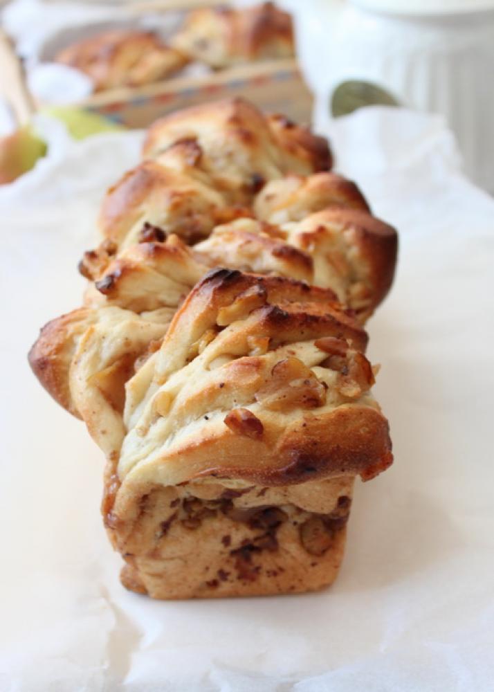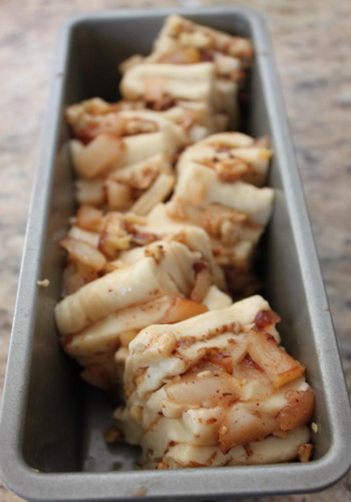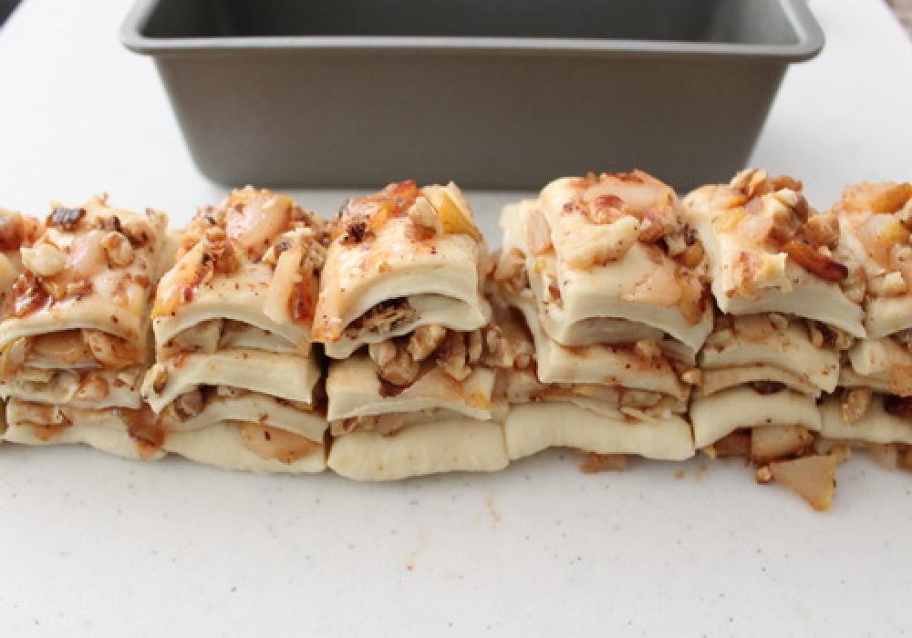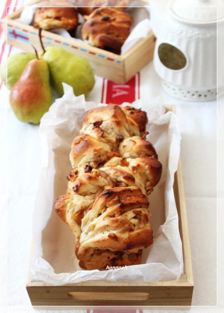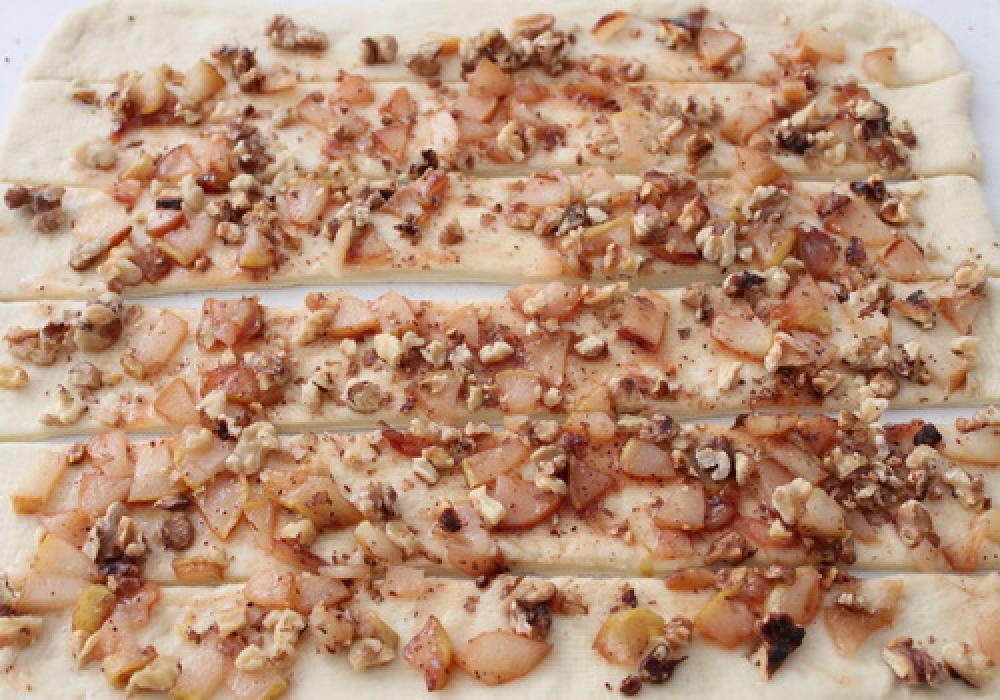 ![]() 30X25センチに伸ばし、2.の冷ました洋ナシ、胡桃をまんべんなくトッピングする。