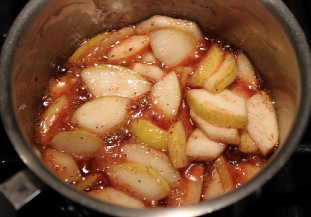 ![]() フィリングの準備。フィリング用のバター~バニラエッセンスを鍋に入れ、カットした洋ナシを入れて5分程煮て冷ましておく。