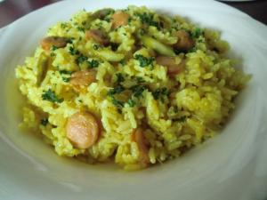 炊き上がったピラフを器に盛り、パセリを散らします。