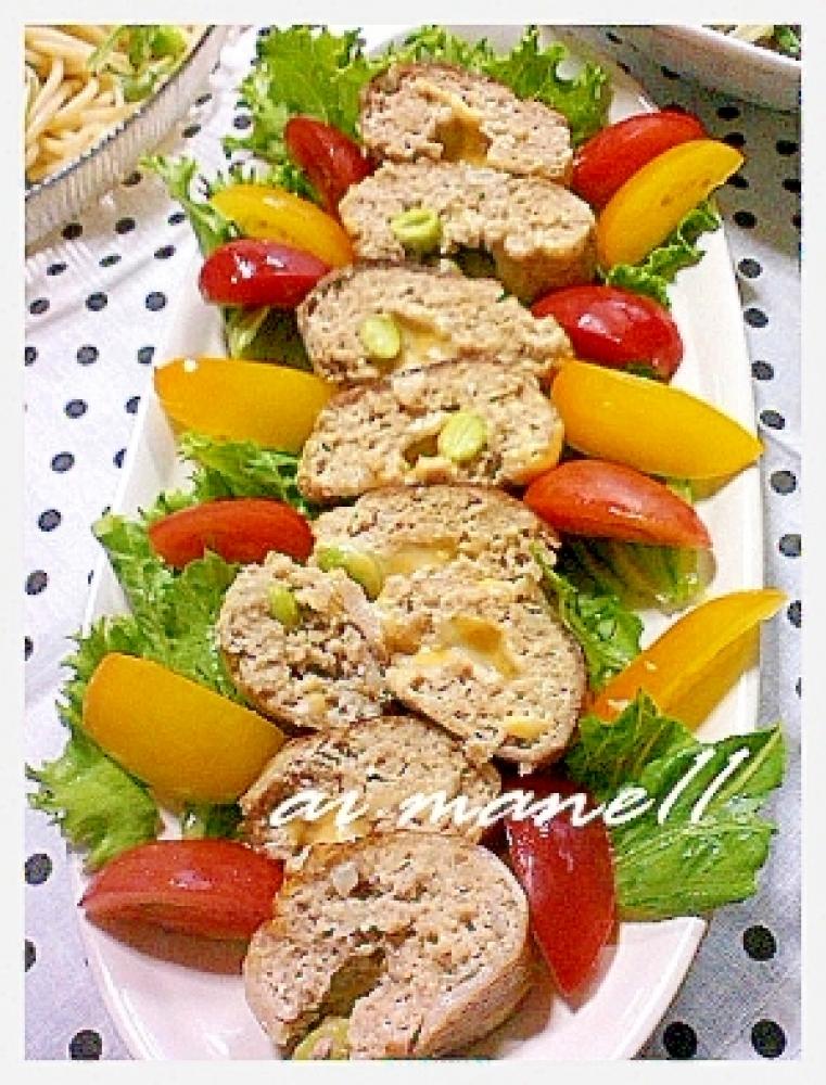 3の上に2を全体にひいたら真ん中にチーズ・枝豆を並べ海苔巻きを巻くようにくるくるっと巻気ます