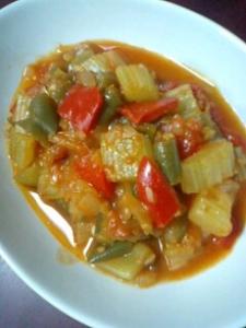鍋にオリーブ油を熱し、3を炒めます。香りが立ったら野菜を炒め、Bとトマトの缶汁ごと入れて蓋をします。