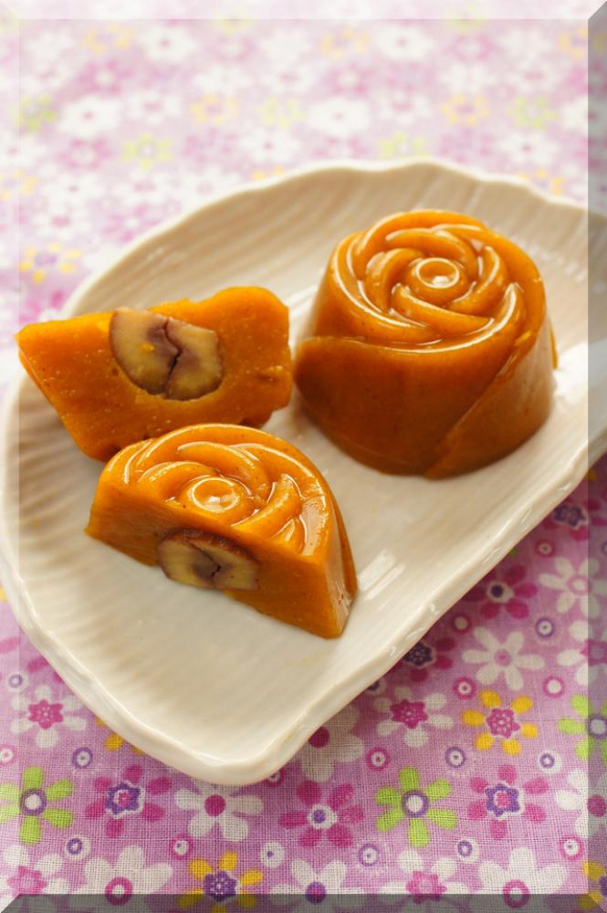 お好きな型に入れ中に甘栗を1個入れます。粗熱が取れたら冷蔵庫で冷やし固めます。型から取りだします。
