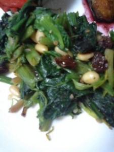 2のホウレン草を加えて中火で炒め、レーズンと松の実を加え、塩、ブラックペッパーで味を調えます。