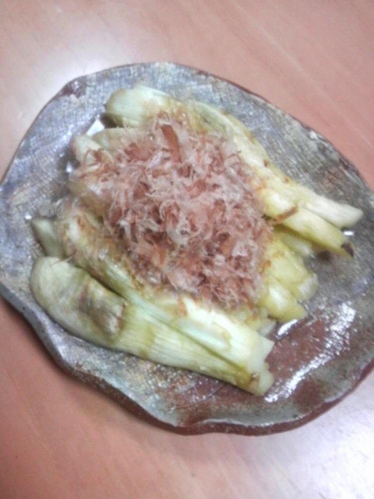 両面魚焼きグリルで10分くらい焼き、熱いうちに皮を剥いて食べやすく切る。