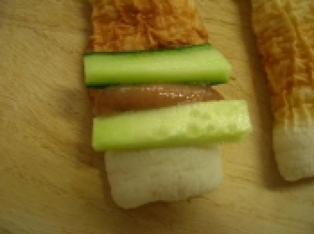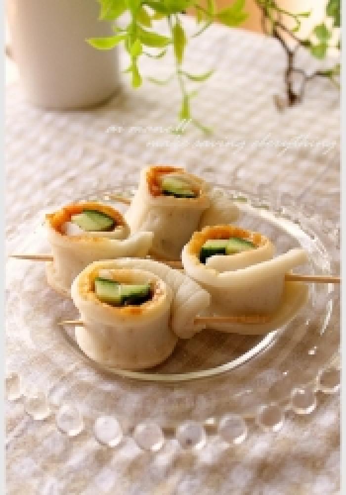![]() 1の竹輪の茶色の部分にキュウリと種を取り包丁で叩いた梅をのせます。