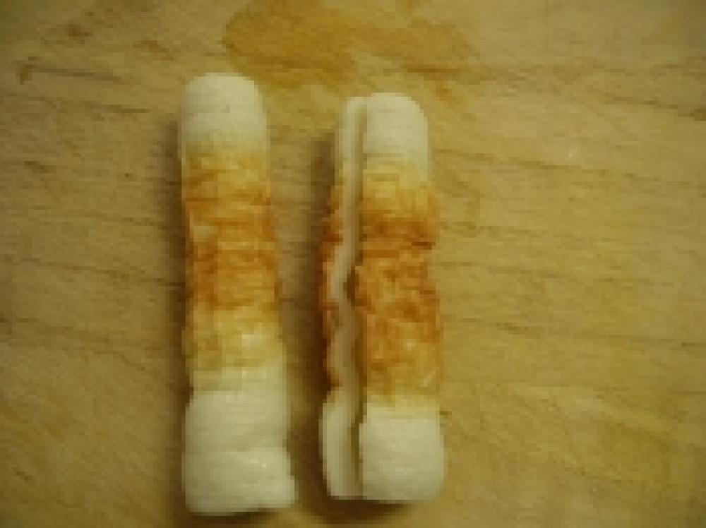 ![]() 3を端っこから巻いていきます。巻き終わりの部分を2箇所爪楊枝で止めます。
