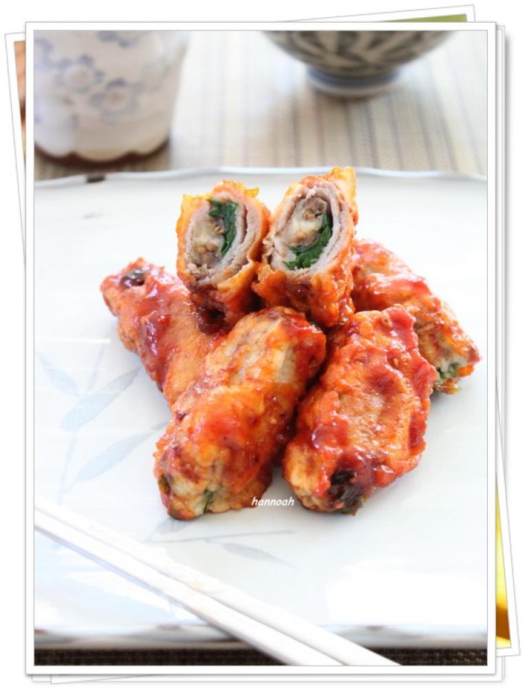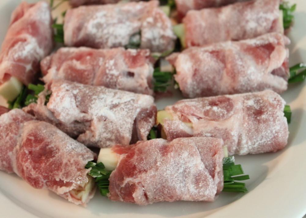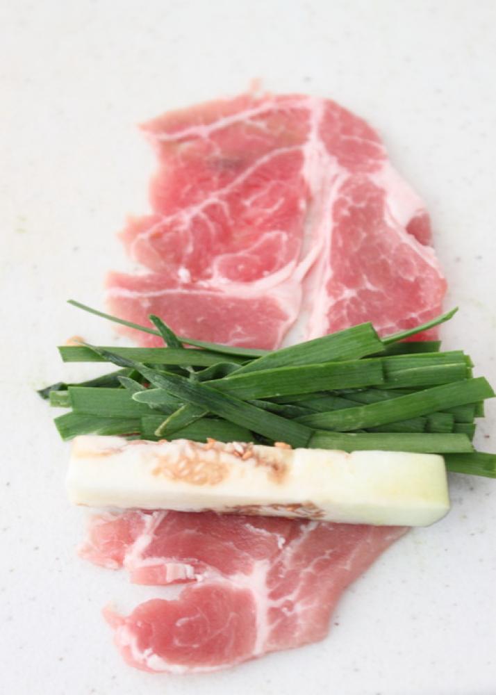 ![]() 軽く塩胡椒した豚肉に、1.の水気を拭いた茄子、食べ易い大きさに切った韮をのせて、手前からくるくると巻く。