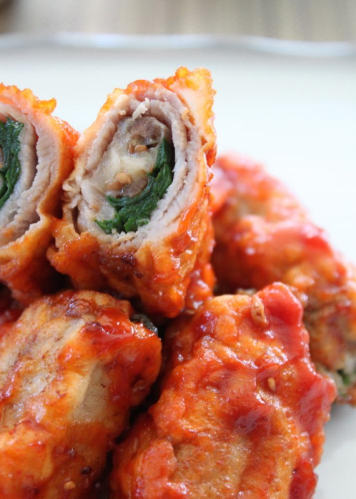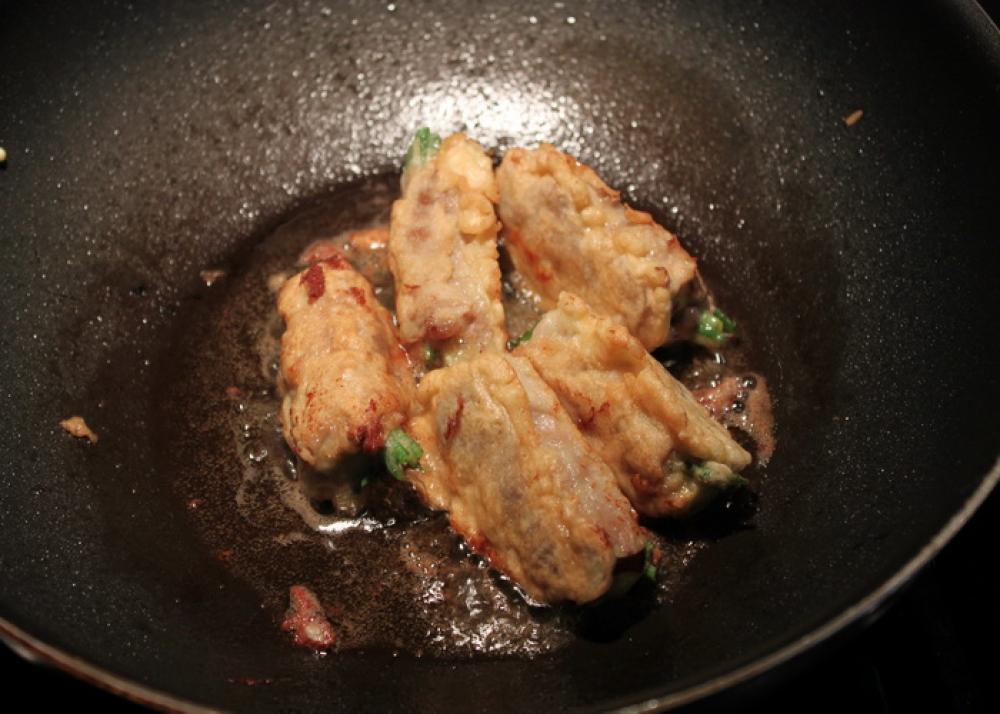 ![]() 大さじ2の油を熱し、つけ衣用の卵、米粉、小麦粉を合わせたものに、3.をくぐらせて揚げ焼きをする。