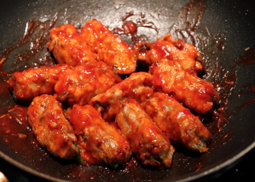 ![]() 4.を戻して、タレと絡める。