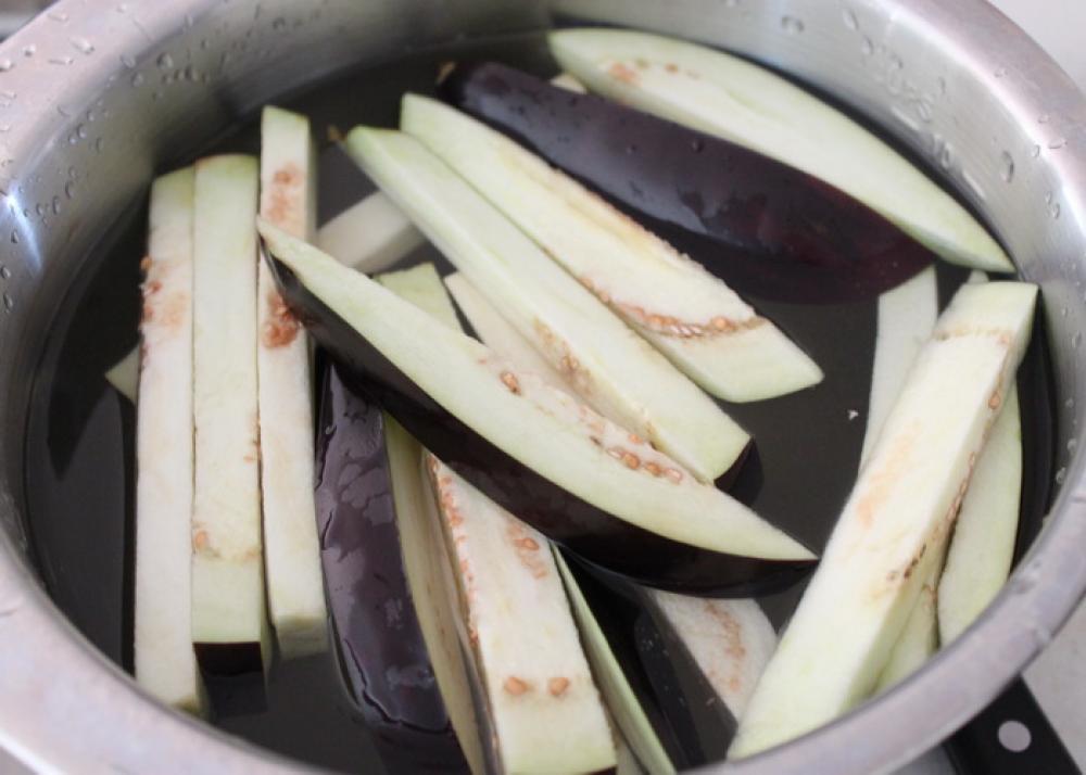 ![]() 茄子を縦に切り、水につけて灰汁抜きをする。