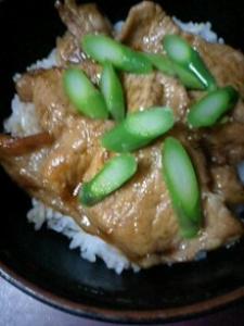 タレをたっぷりからませた豚肉を、ご飯の上に乗せ、お好みで青みの野菜をのせます。