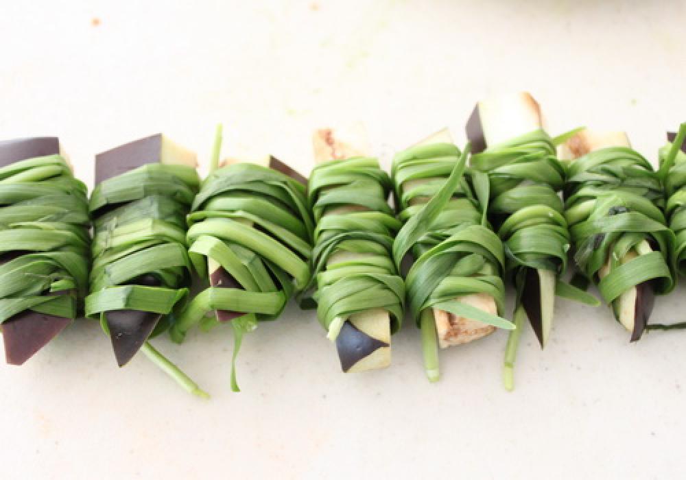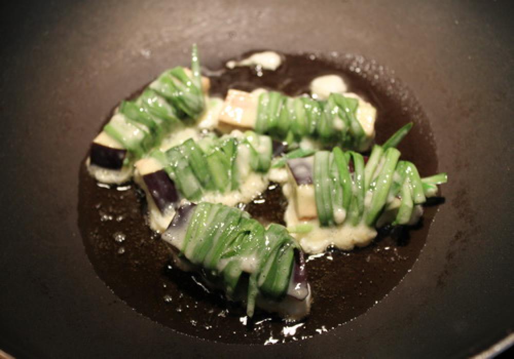 ![]() 5~6㌢程の長さに切った茄子に、韮を巻きつける。