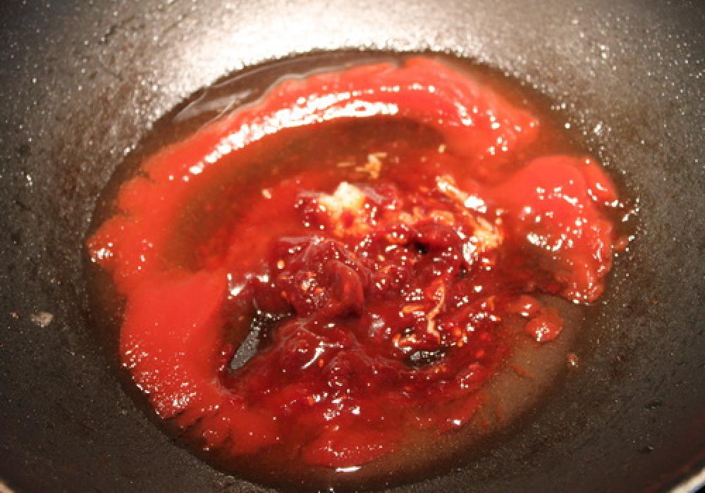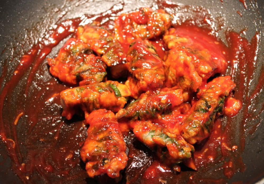 ![]() フライパンをさっとふき取り、タレの調味料を少し煮立たせる。