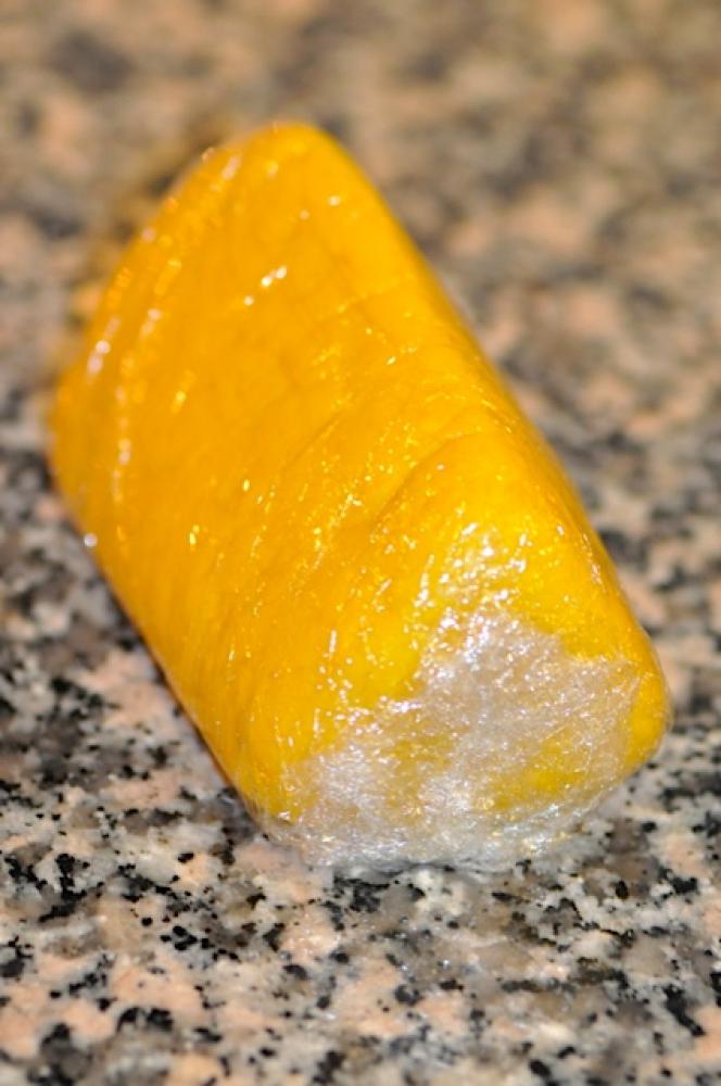 ![]() ひとかたまりにして、三角の棒状にしてラップを巻いて、冷蔵庫で30分以上休ませる。