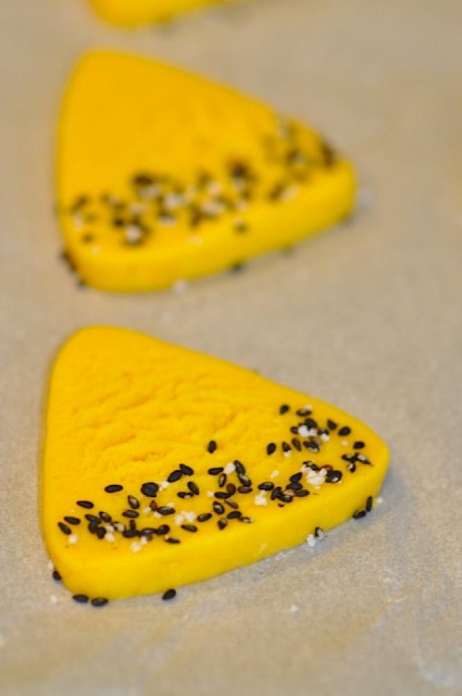 ![]() 0.5cm幅に切って、クッキングシートの上に並べ黒ゴマを下の部分にかけ、軽く手でおさえる。