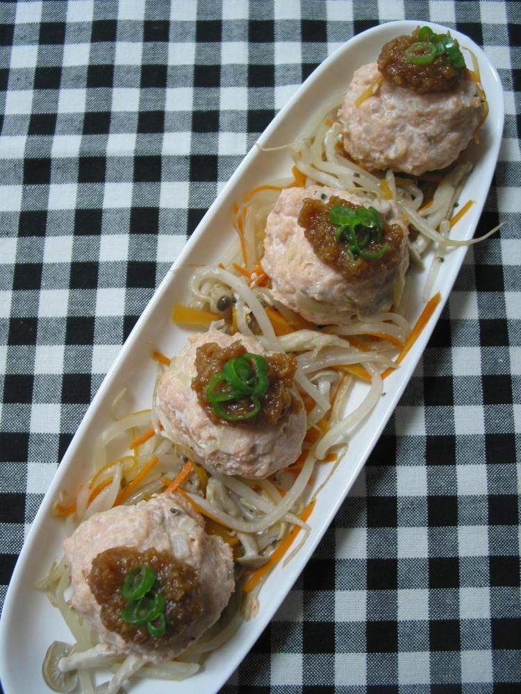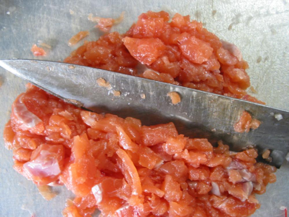 ![]() 鮭は皮と骨を取り除き、包丁でたたいて粘りを出す。みじん切りにした生姜と玉ねぎ、片栗粉、塩・胡椒、酒を加えてよく混ぜる。