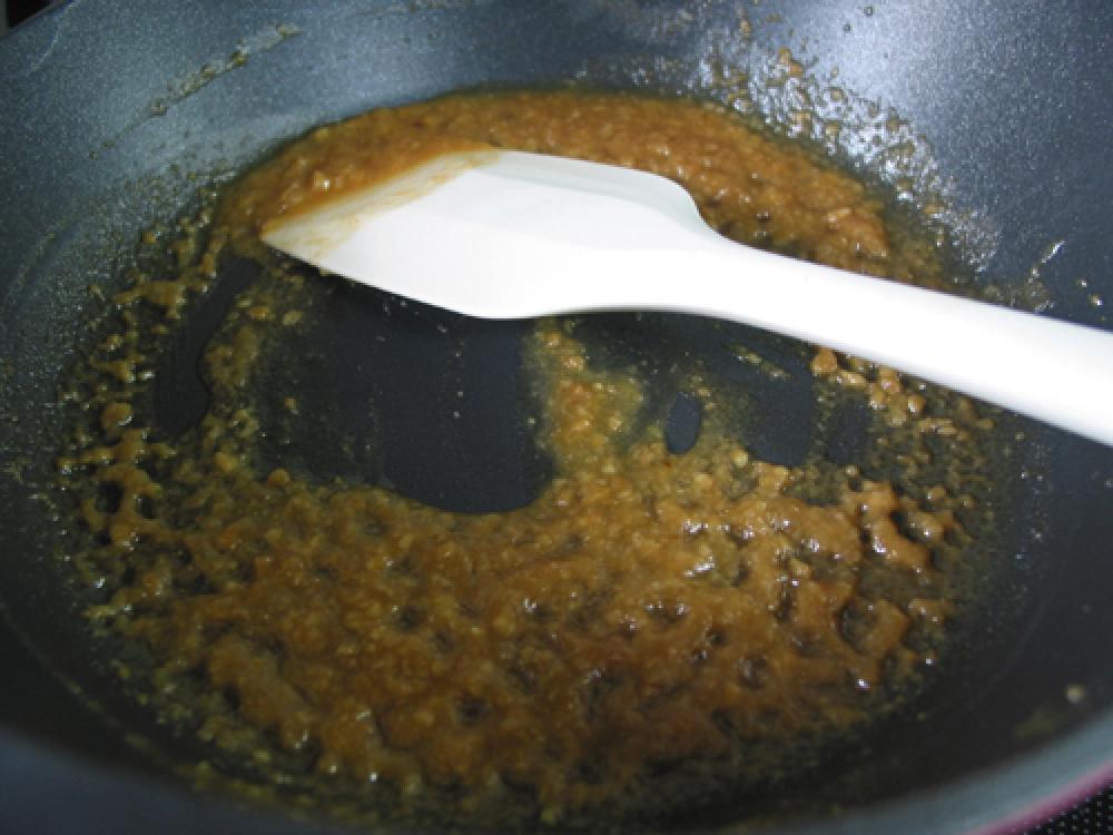 ![]() フライパンに味噌、ラカントS顆粒、酒小さじ4を加えて香ばしい香りがして、テリが出るまで過熱する。