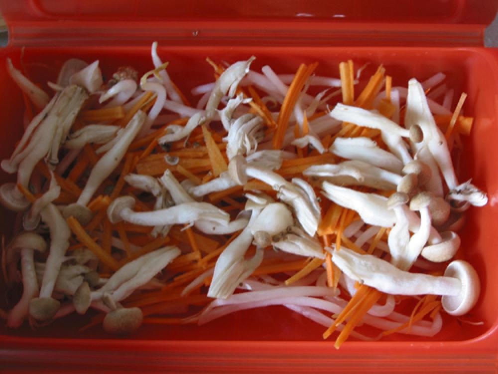 ![]() 耐熱容器に千切りにした人参、ほぐしたしめじ、もやしを入れる。軽く塩・胡椒する。