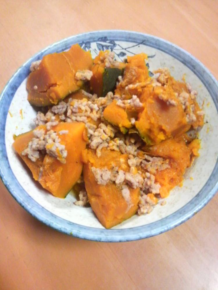 圧力鍋にかぼちゃとひき肉、めんつゆ、ラカントS顆粒を入れ火にかける。