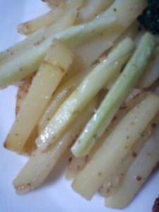 フライパンにサラダ油を熱し、1、2を炒めます。ジャガイモがすき通ったら、混ぜ合わせたAを回しいれて味をからめます。