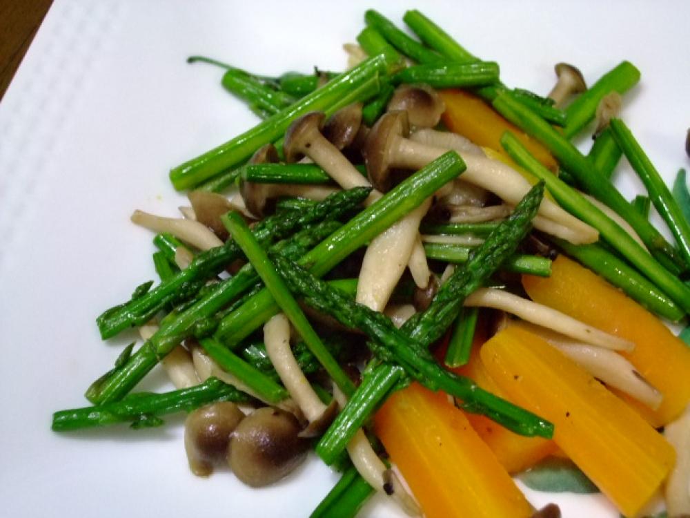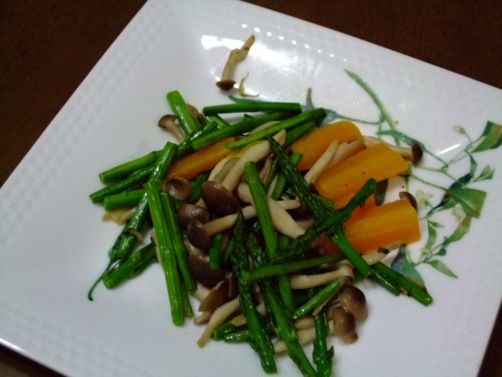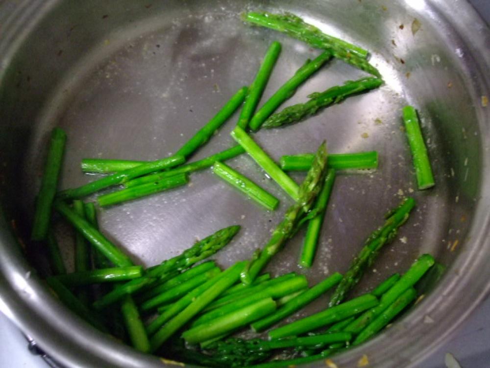 ![]() フライパンに油を熱しアスパラの茎から弱火で炒めます