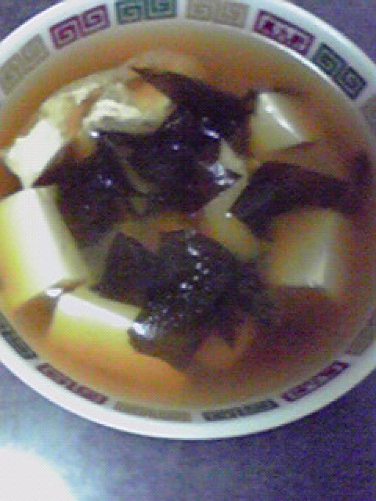 豆腐を入れて温め、温まったら、わかめ・油揚げを入れ、仕上げに味の素をふります。