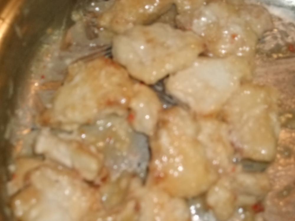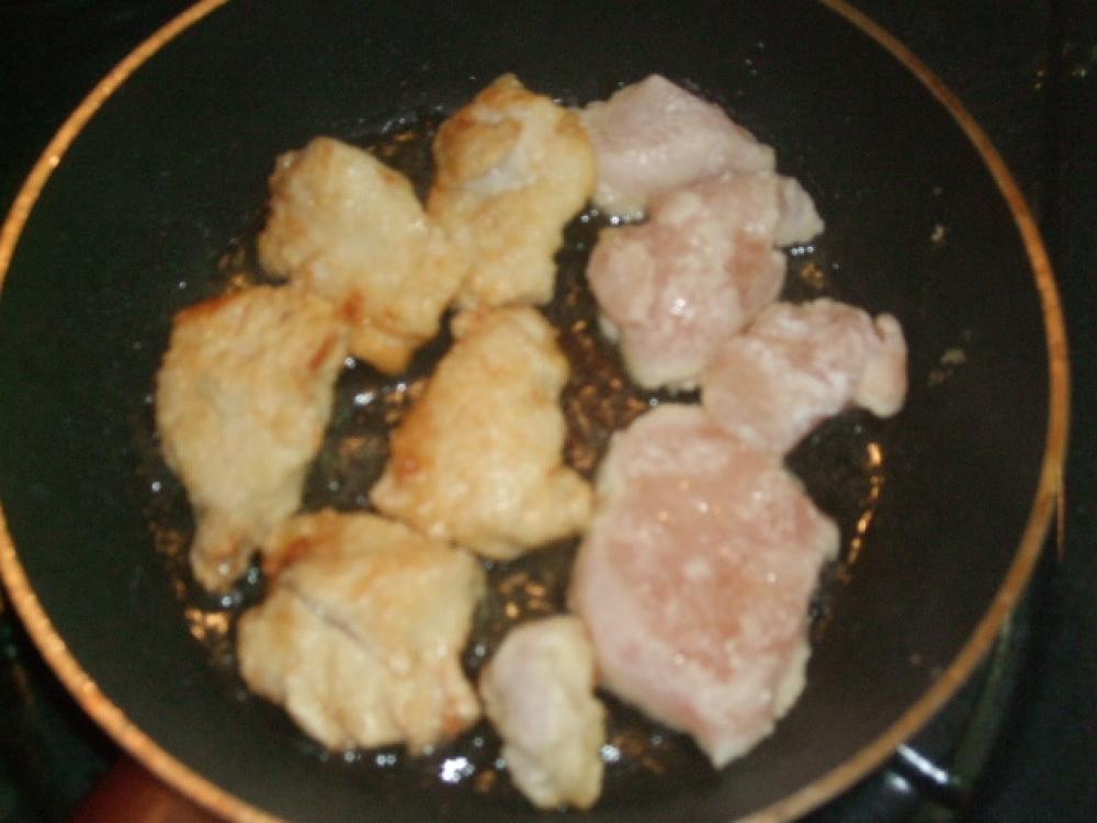ムネ肉を少量の油で色付く程度に焼き揚げます |