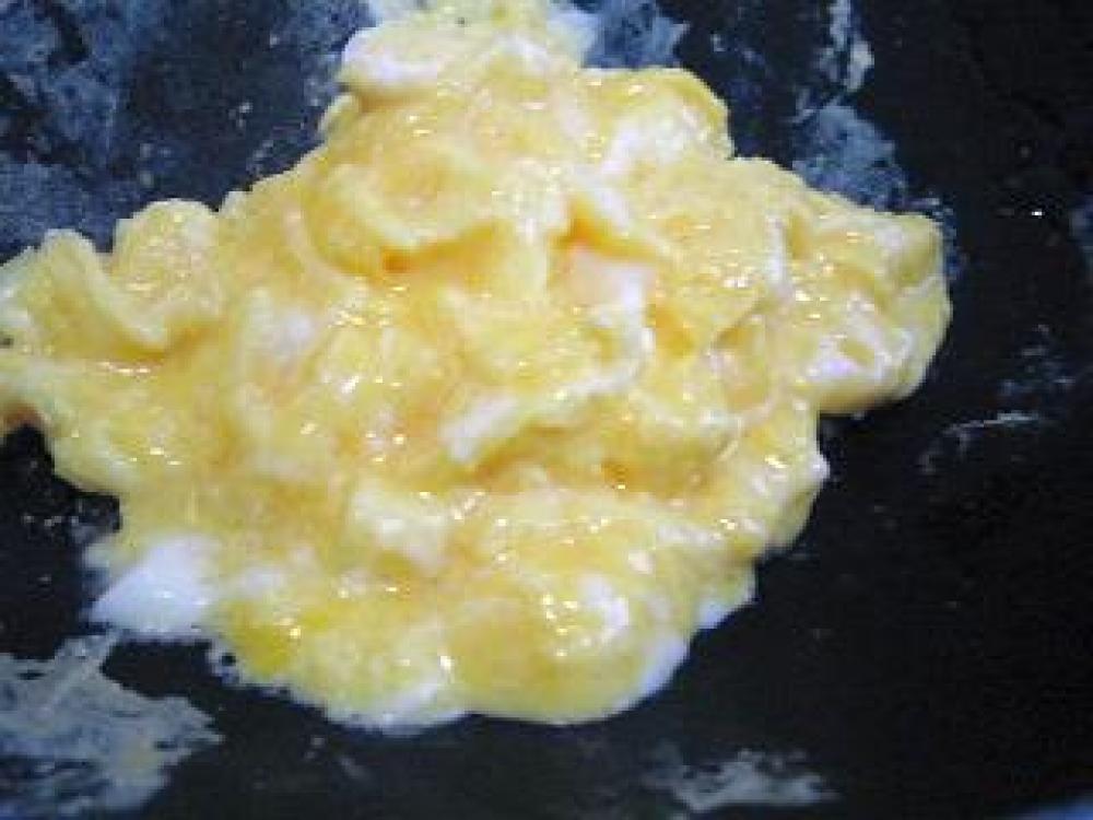 ![]() 油を熱したフライパンに、溶いた卵を入れて大きく混ぜ半熟程度でいちど取り出す。