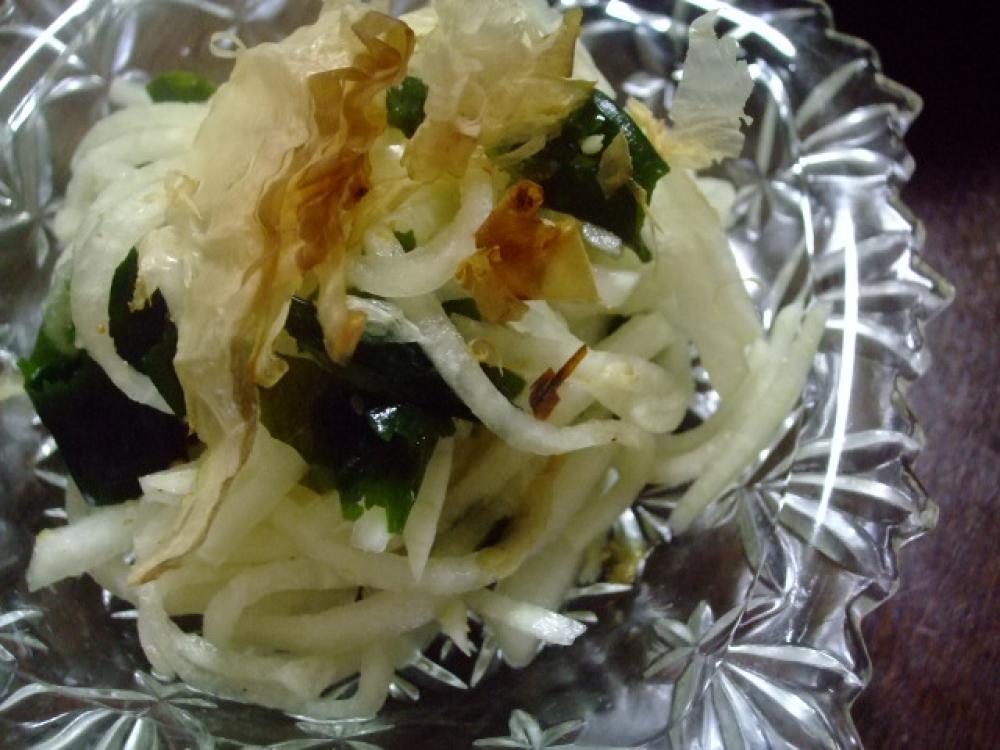 大根は皮を剥き、厚さ5mmの細切りにします