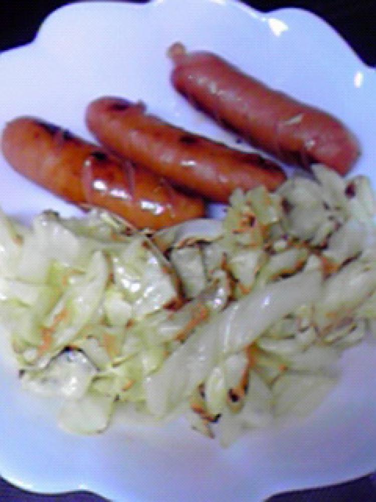 フライパンにウインナーとキャベツを並べ、火にかけます。