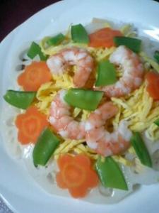 1の酢めしに2のシイタケ、白ゴマを混ぜ込んで、器に盛り、6の錦糸卵とその他の具材をちらします。