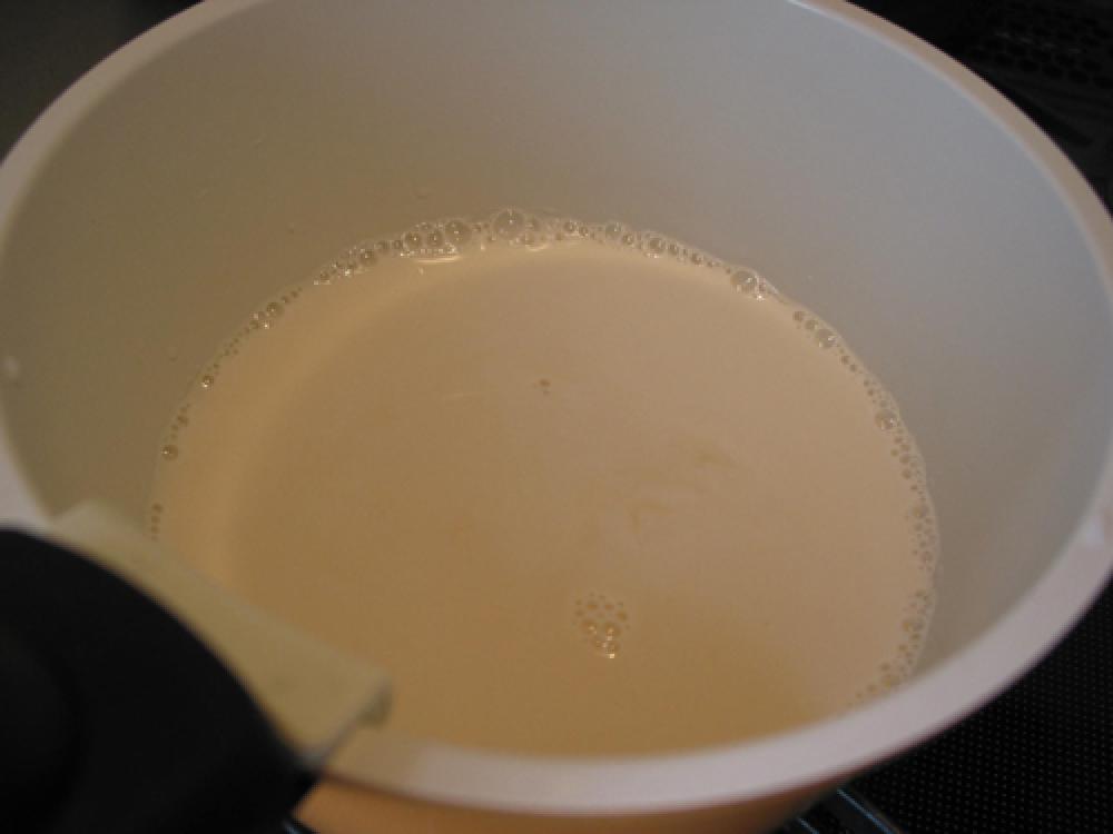 ![]() 鍋に豆乳、バニラエッセンス、ラカントS顆粒大さじ1を加え温める。(沸騰させない)