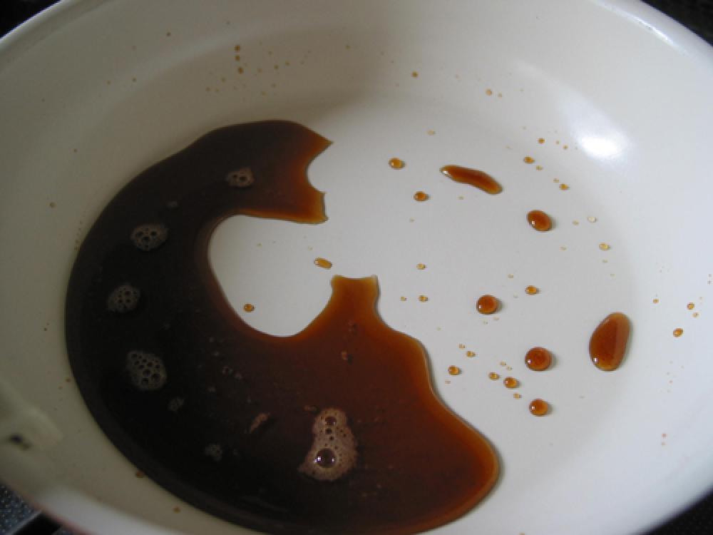 ![]() フライパンに水大さじ2とインスタント珈琲を入れて溶かし、ラカントS顆粒大さじ2を加えて煮立たせる。