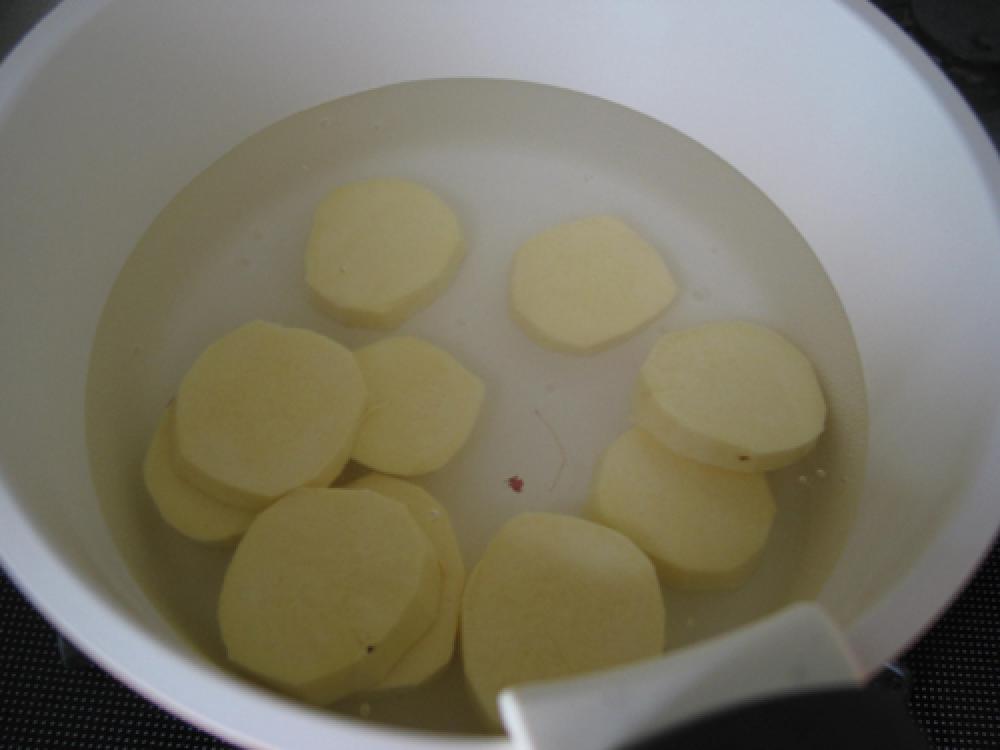![]() さつま芋は皮をむき、5mm幅の輪切りにして柔らかくなるまで茹でる。ゼラチンは水大さじ1を加えてふやかしておく。