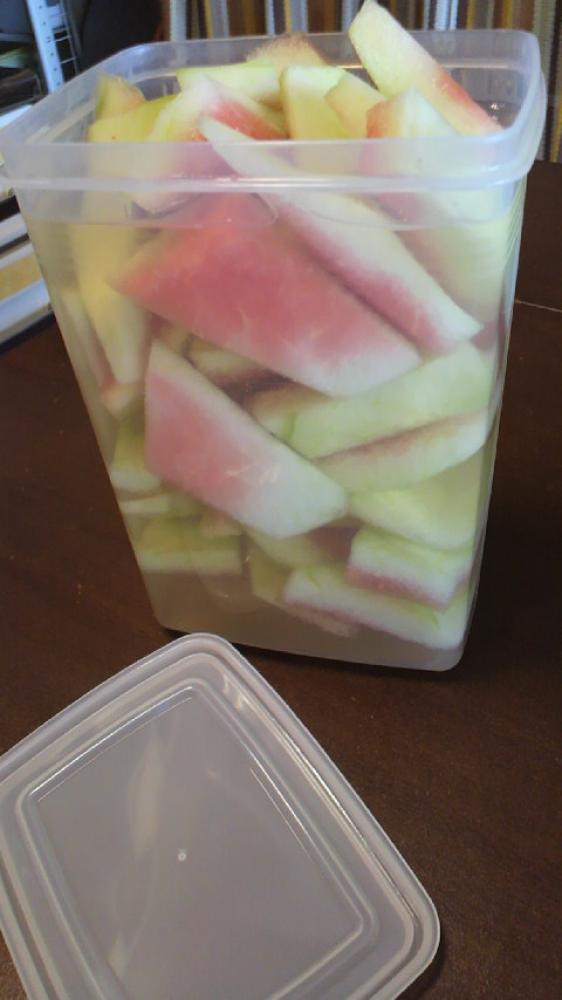 スイカの皮の白い部分を食べやすい大きさにカットし、ラカント液状+酢+塩の液体に浸す
