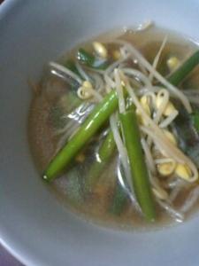 鍋にゴマ油、ショウガを入れて炒め、香りが立ってきたら豆モヤシ、ニンニクの芽を加えて、サッと炒めます。