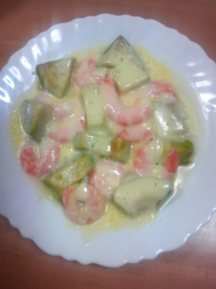 耐熱皿に海老、切ったアボカドを乗せ、レモン汁を少々振ってから溶けるチーズを乗せて、レンジに2分くらいかける。
