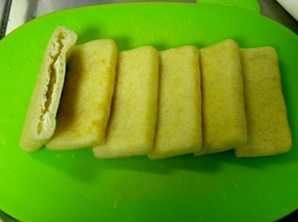 ![]() 油揚げ(寿司揚げを使用してください)を長方形の形で半分に切ります。