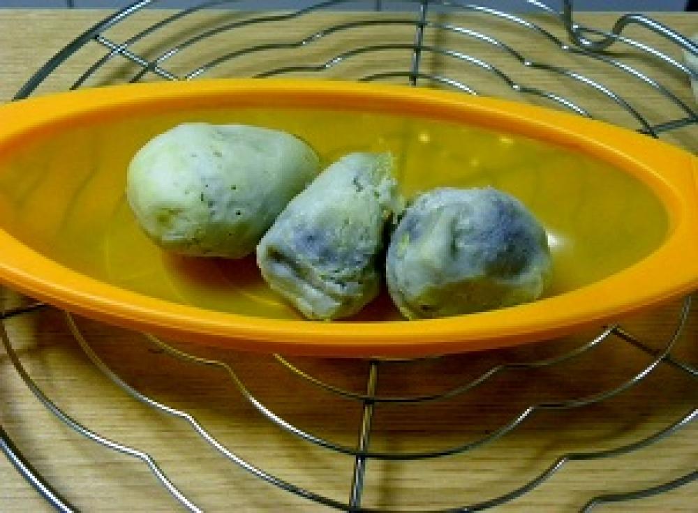 ![]() 里芋はよく洗って皮のまま、シリコンスチーマーに入れ、ふたをして600Wで5分、竹串がスッと通るまで加熱します。