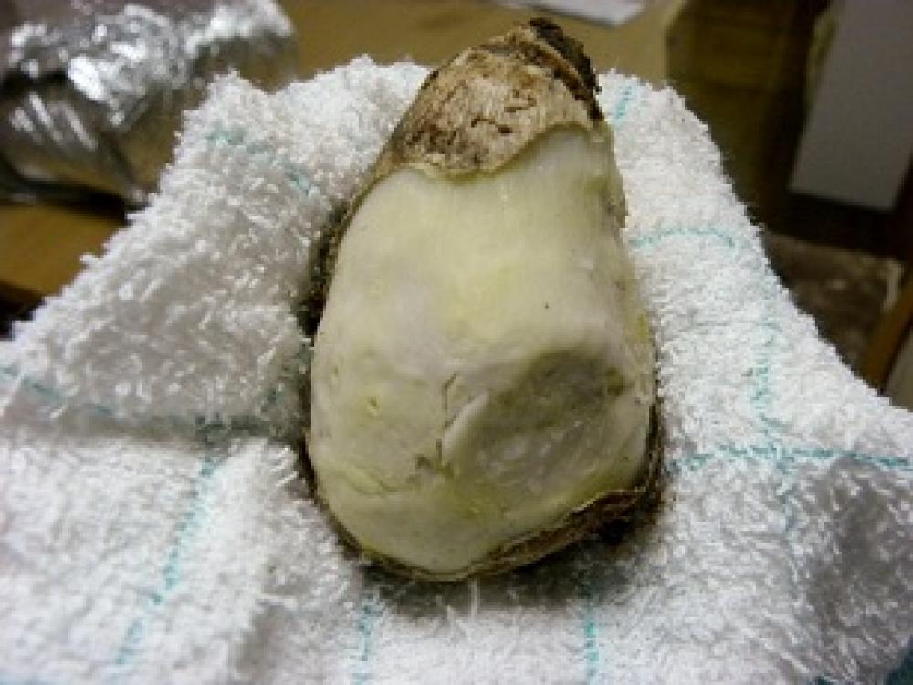 ![]() 加熱が終わった里芋は、必ず乾いたふきんかタオルで持ち皮をむきます。熱いうちにすりこ木などでつぶしておきます。