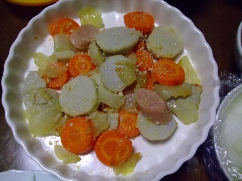 にんじんも輪切に たまねぎはざく切り ソーセージは斜 |