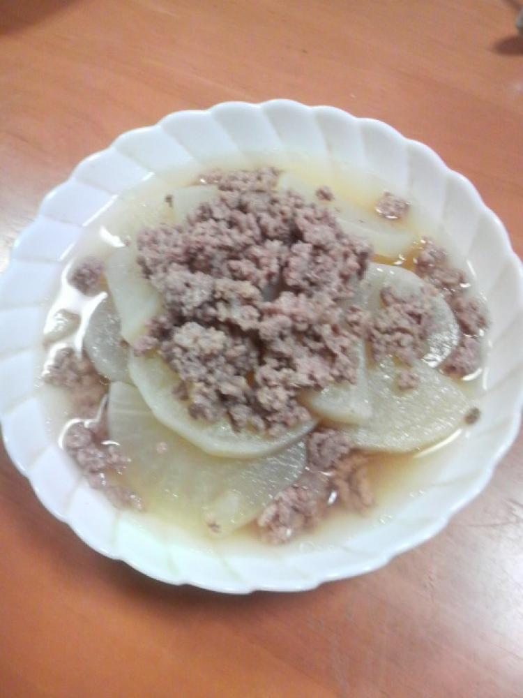 圧力鍋に大根、豚のひき肉、水、めんつゆを入れて火に掛け、沸騰したら弱火で8分煮て火を止め、5分以上蒸らす。