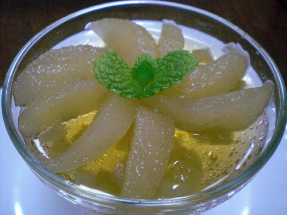 冷蔵庫で冷やし、食べる際に梨のコンポートを飾る。