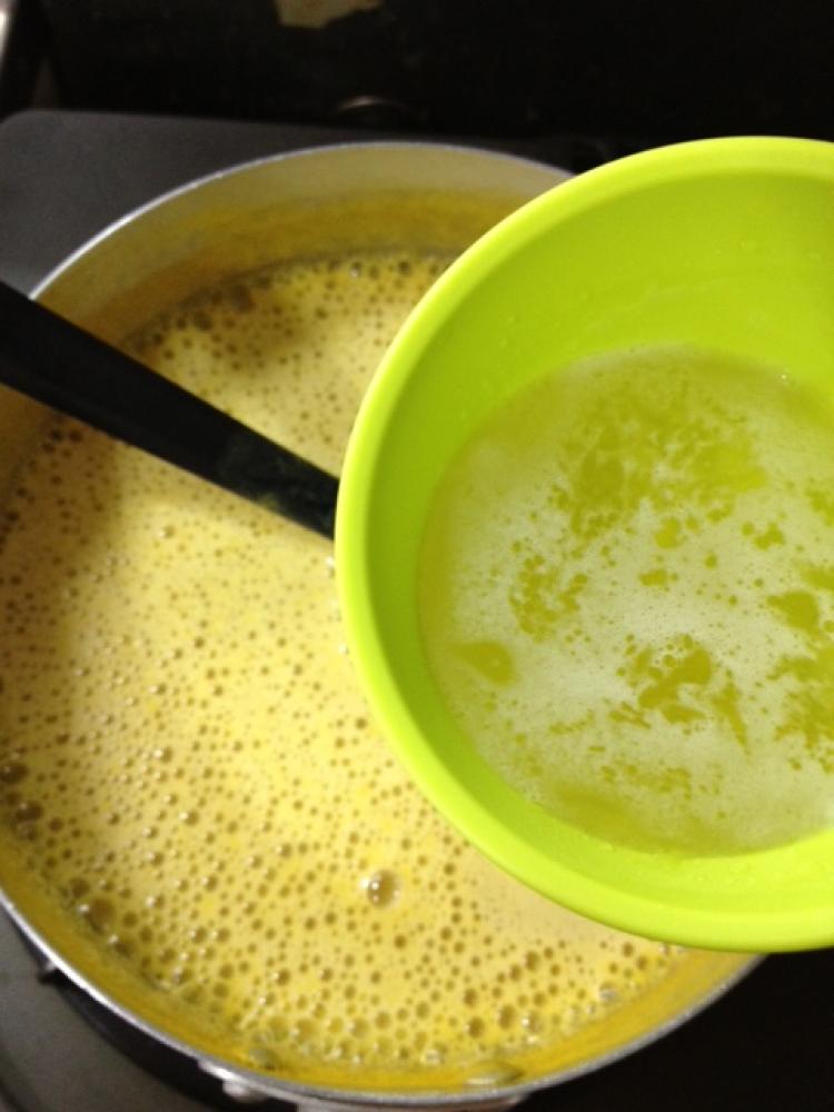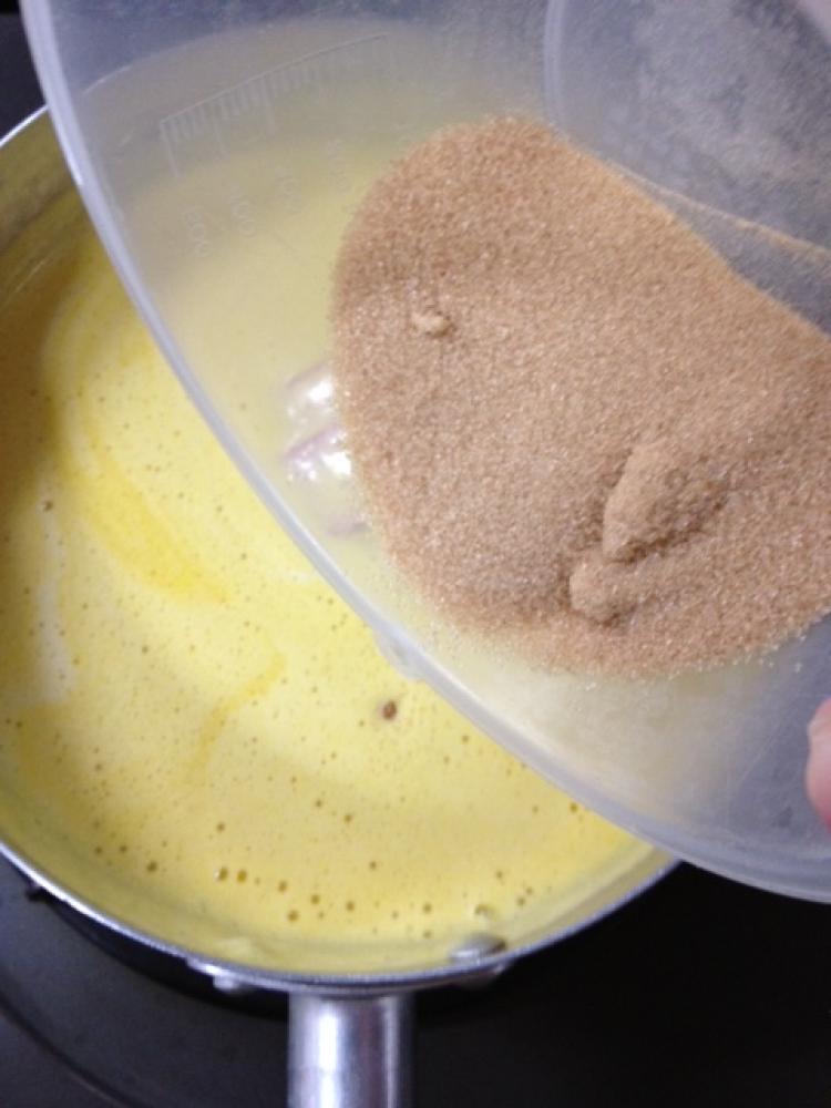 ![]() 3を鍋に移し、ラカントS顆粒、バニラエッセンス、ラム酒を加え混ぜます。