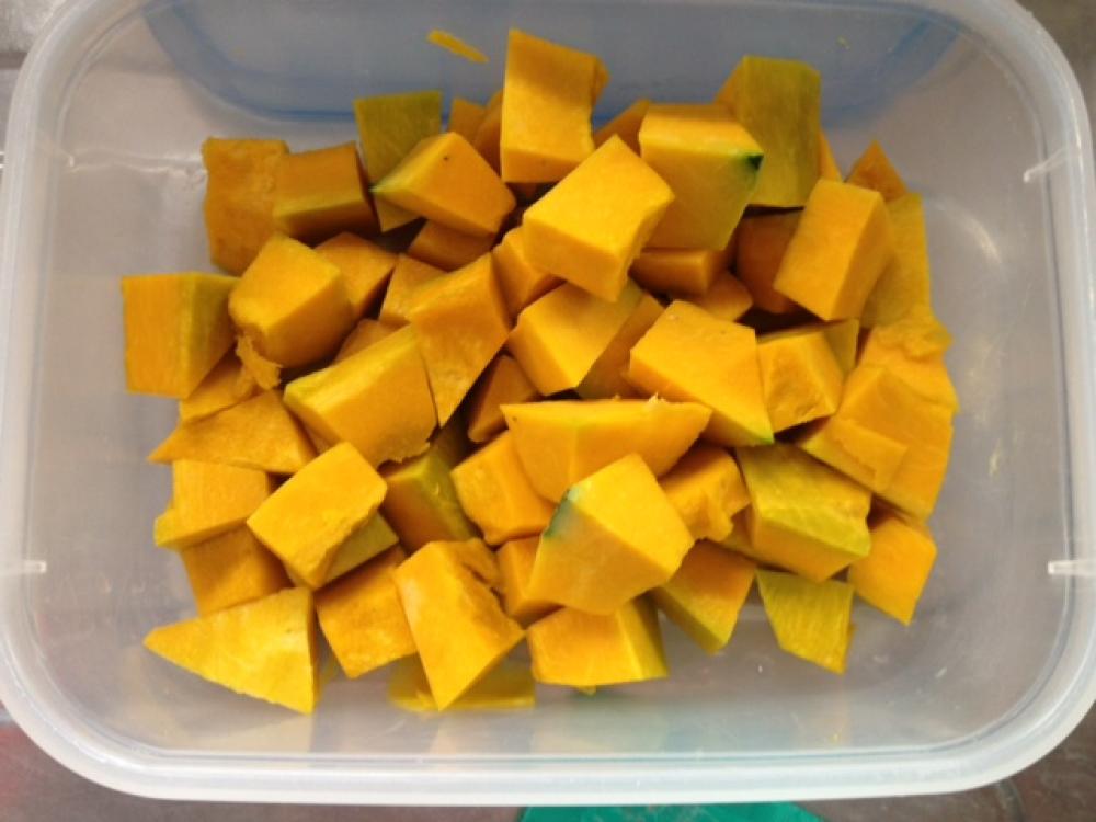 ![]() カボチャは種をとり、皮をむいて小さくカットしラップをしてレンジで3~4分加熱します。